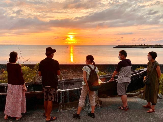 サバニや蟹の水槽がある養殖場で、蟹蔵と一緒に夕日を観ながら海に沈む夕日を楽しみました。
