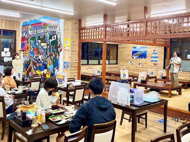 食事をしながら、佐良浜一本釣り漁師の話や実際の動画などもプロジェクターに映写して楽しんでいただきました。